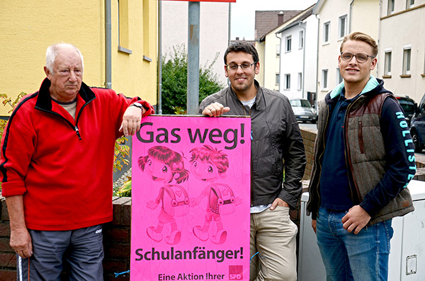 Damit die Schulanfänger sicher zur Schule kommen, hat der SPD-Ortsverein Weiterstadt wieder Plakate mit einem Hinweis rund um die Grundschulen in Weiterstadt und den Stadtteilen aufgestellt. Durch die Aktion sollen die Verkehrsteilnehmer sensibilisiert werden. Das Bild zeigt Günter Merlau, Benjamin Gürkan und Julius Schafhausen beim Aufstellen der ersten Plakatständer an der Carl-Ulrich-Schule.