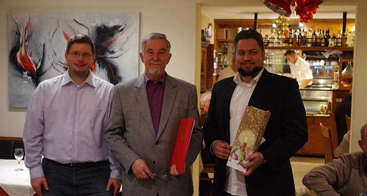 „Der Worte sind genug gewechselt. Wir wollen hier keine große Politik machen, sondern gemütlich zusammen sitzen und plaudern“ eröffnete Geter den geselligen Teil des Abends. Nach ausgiebigem Studium der Speisekarte gab es noch einmal eine kurze Unterbrechung, als Geter und Koch einen Genossen für 40 Jahre Parteizugehörigkeit ehrten. Arno Amthor nahm sichtlich gerührt die Urkunde und Ehrennadel entgegen und versprach: „Von nun an seht ihr mich öfter hier bei euch, denn viele meiner Ehrenämter habe ich in die fähigen Hände meiner Nachfolger übergeben und so Zeit für mehr Engagement in der Politik gefunden.“ Ganz unpolitisch blieben die Gespräche der Gäste dann aber doch nicht, vielseitig wurde Verwunderung über den neuen Fahrradunterstand in der Riedstraße geäußert, die langwierige Instandsetzung der Wiesenstraße und den damit verbundenen unzureichenden Sicherungsmaßnahmen der Baustelle bemängelt oder aber die wieder stattfindende, illegalen, nächtlichen Straßenrennen auf dem Einbahnstraßenring rund um das LOOP5 mit Sorge betrachtet. Doch die besinnliche Stimmung, die nachbarschaftlichen Plaudereien, standen eindeutig im Vordergrund und unterstrichen einmal mehr den familiären Charakter des Ortsbezirks. Abschließend ließ Geter es sich nicht nehmen, der guten Seele der Riedbahn SPD, Ursel Scherer, von ganzem Herzen und im Namen aller für ihr unermüdlichen Einsatz und die wieder liebevoll gepackten Präsenttüten zu danken.