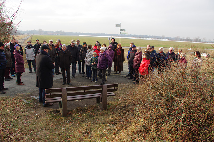 Unter der Autobahn durch ging es dann Richtung Gehaborner Hof. Ein kurzer Halt zum Gedenken an Gerd Körner fand an der von seiner Frau und ihm gestifteten Bank unweit des Darmbaches statt, der die Riedbahn SPD bereits zweimal zu einem neuen Stiftungsschild verholfen hat, da Vandalen es entfernt hatten.
