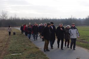 Bei winterlichem Kaiserwetter versammelten sich vergangenen Sonntag wieder knapp 50 frischluftbegeisterte Menschen in der Riedbahn, um am traditionellen Winterspaziergang der SPD Riedbahn teilzunehmen. „Wir brauchen zwar noch keine Busse, wie beim Grenzgang der Stadt, um die Teilnehmer herzubringen“, eröffnete Stephan Geter (Vorsitzender des SPD Ortsbezirkes Riedbahn) die Veranstaltung, „trotzdem heiße ich die Anwesenden aus den benachbarten Stadtteilen im höchstgelegenen Ortsteil herzlich willkommen.“ Mit von der Partie waren neben vielen interessierten Bürgern, die Landtagsabgeordnete Heike Hofmann, Bürgermeister Ralf Möller, der Erste Stadtrat Werner Thalheimer, so wie weitere Magistrats-und Parlamentsmitglieder. Geter, der sich vom sogenannten „Hügelgrab“ aus Gehör verschaffte, teilte ortsbezogen mit, dass die Aufschüttung neben dem Bahnübergang im Frühjahr eingeebnet und neu begrünt wird, um dann vielleicht mit einer Bank versehen für die Anwohner mehr nutzen darstellt, als bisher. Bürgermeister Ralf Möller leistete ihm kurz Gesellschaft auf der Anhöhe, um über den Stand der Bauarbeiten der neuen Sammelunterkunft für Asylbewerber Ecke Riedstraße/Gutenbergstraße zu berichten. Geplant ist hier eine Regelbelegung von bis zu 90 Personen. Der Vertrag läuft über zehn Jahre. Anschließende Planungen sprechen von einem Boardinghaus, einer preiswerten Gästeunterkunft. Eine Umwandlung in sozialen Wohnungsbau sei zurzeit nicht möglich, so Möller, da es sich hier um ein Gewerbegebiet handele. Dazu müsse gegebenenfalls das Baurecht angepasst werden. Der Bürgermeister nutzte die Gelegenheit, um sich noch einmal bei allen Helfern, die sich um die ausländischen Gäste kümmern, zu bedanken.