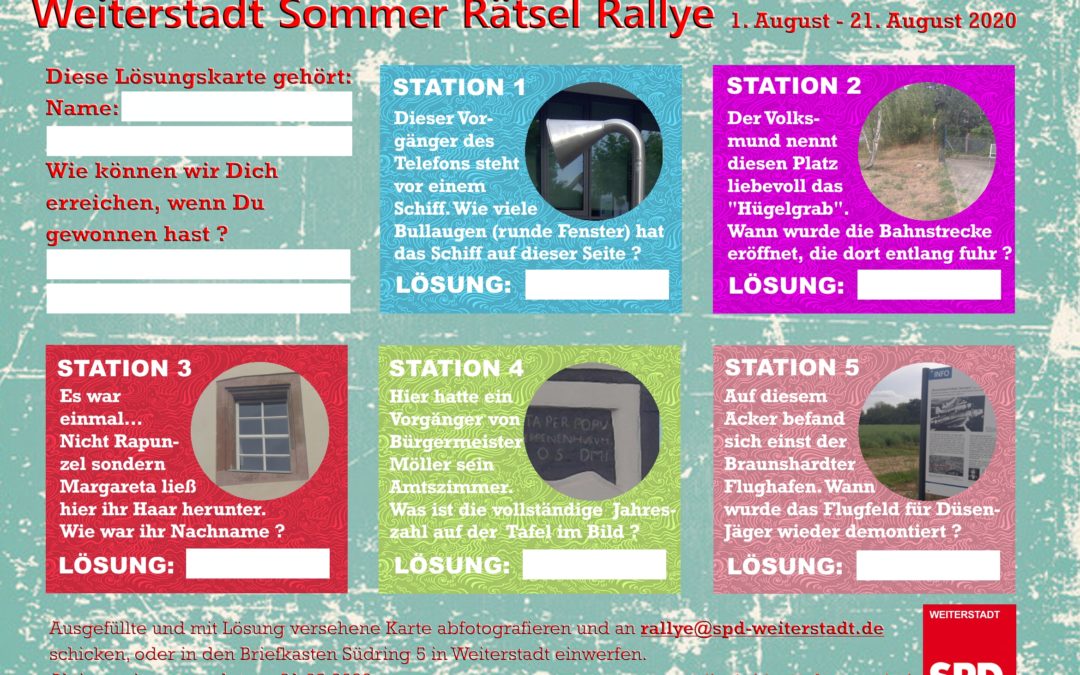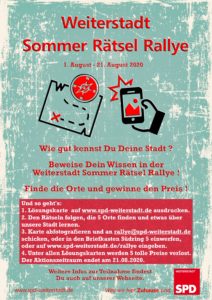 Wir laden große und kleine Weiterstädter ein, an unserer Stadtrallye durch die Ortsteile der Kommune teilzunehmen. Schöne Preise warten auf euch! Es gilt, ein paar einfache Fragen zu beantworten, indem dem man die Stellen aufsucht, die in den Fragen beschrieben werden. Das ist gar nicht schwer und bringt ein bisschen Abwechslung und Spannung in den August. Die Teilnahme ist ganz einfach: Das Bild mit den Fragen ausdrucken, alle beantworten, dann einscannen oder abfotografieren und an rallye@spd-weiterstadt.de senden. Bis zum 21.08. könnt ihr teilnehmen. Unter allen richtigen Antworten werden die Gewinner ausgelost, der Rechtsweg ist ausgeschlossen. VIEL SPASS UND ERFOLG ALLEN TEILNEHMERN!!!