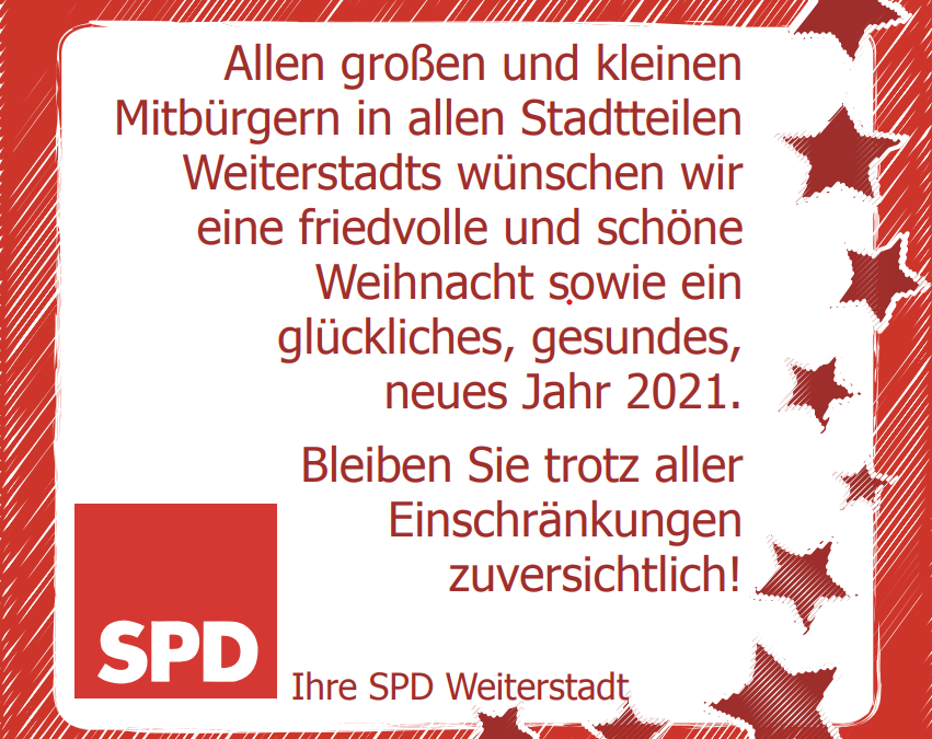 Die Weiterstädter SPD wird alles tun, was in ihrer politischen und gesellschaftlichen Kraft steht, um für Sie ein gutes, gesundes, neues und doch möglichst normales Jahr 2021 mit zu gestalten.