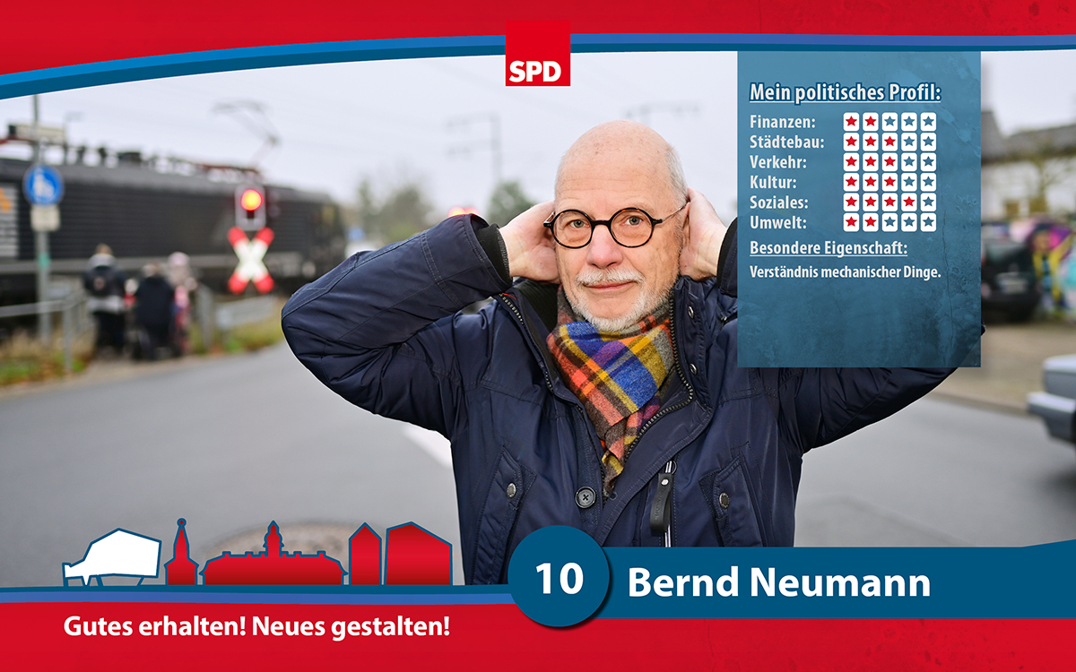 Alle Interessen in der Bevölkerung betrachten mit Kita und Schullandschaft im Schwerpunkt. Neues heißt, die Stadtentwicklung voranzutreiben und z.B. das Baugebiet zu entwickeln. Ich möchte die Mobilitätswende gestalten und setze mich für mehr Sicherheit, guten Lärmschutz und eine Verhinderung der geplanten Bahnneubautrasse ein. Eine gute Infrastruktur, Wirtschaftswachstum und Lebensqualität sind mir ebenfalls wichtig.