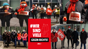 Bereits seit einigen Wochen versammeln sich zahlreiche engagierte Genossinnen und Genossen jeden Montagabend zu einer angemeldeten Mahnwache mit den nötigen Hygieneregeln, um zu zeigen, dass man hier auch ohne Regelverstoß öffentlich seine Meinung kundtun kann, ohne andere zu gefährden. Gleichzeitig möchten wir unsere Besorgnis darüber zum Ausdruck bringen, dass unbescholtene Bürger, die die Maßnahmen zum Schutz gegen Corona einfach nur kritisch hinterfragen wollen, von demokratiefeindlichen, im rechten Spektrum angesiedelten Bauernfängern für ihre idiologischen Zwecke missbraucht werden. Denn mit uns gilt weiterhin: Keinen Meter nach rechts!