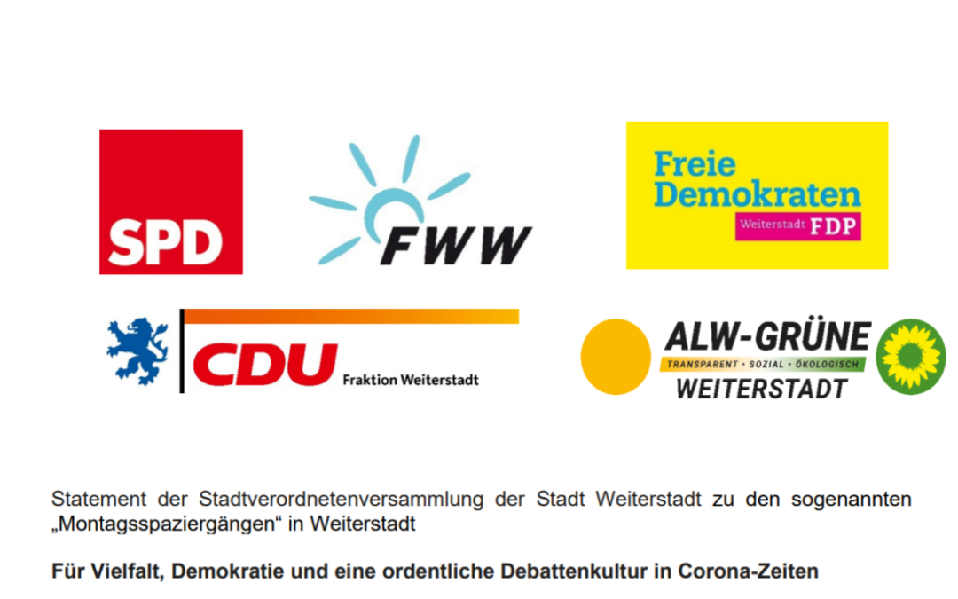 In der Stadtverordnetenversammlung vom 10. Februar 2022 verabschiedeten alle Abgeordneten und der Bürgermeister gemeinsam ein Statement zu den sogenannten „Montagsspaziergängen“ in Weiterstadt.